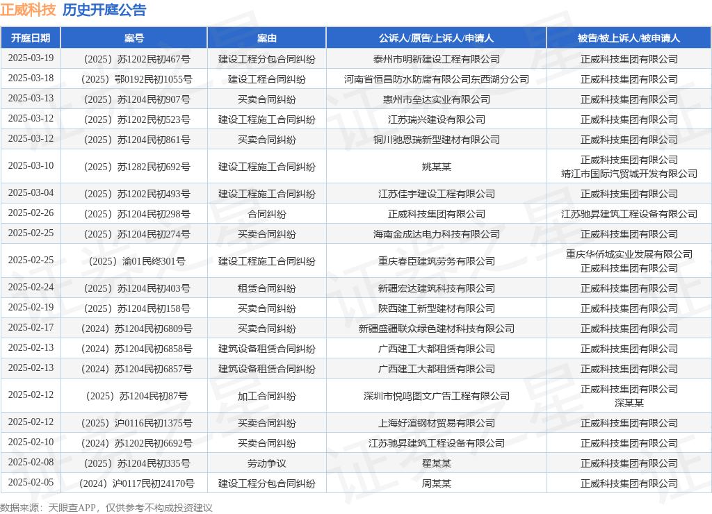 案号:(2025)苏1204民初158号审理法院:泰州市姜堰区人民法院案由:买卖合同纠纷当事人信息: 原告/上诉人:陕西建工新型建材有限公司 被告/被上诉人:正威科技集团有限公司开庭日期:2025年2月19日根据统计,近一年内以正威科技集团有限公司为当事人的历史开庭公告有141则,其中案由为“买卖合同纠纷”的公告以44则居首,其次为“建设工程施工合同纠纷”有17则,“建设工程分包合同纠纷”有16则。历史开庭公告(前20条)如下:
